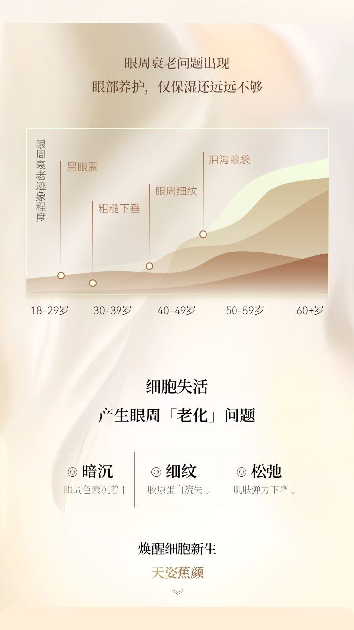 天姿蕉颜焕颜眼霜,蕴含麦角硫因、依克多因、类蛇毒肽等珍贵抗衰修护成分,同时甄选天然植物大蕉果、芦荟、甘草根、当归根、山茱萸果等多种植萃精华。