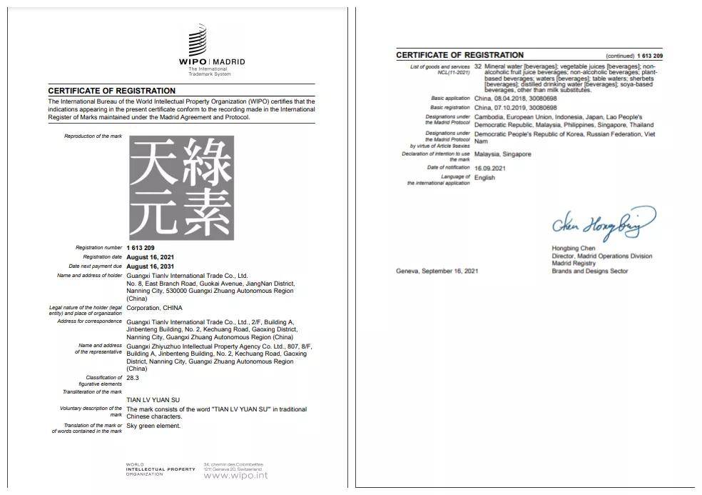 2021年9月16日,天缘绿集团旗下“天绿元素”商标获得了马德里国际注册商标。这是天缘绿集团发展史上的又一里程碑,标志着集团全球商标品牌战略取得了显著的成效。