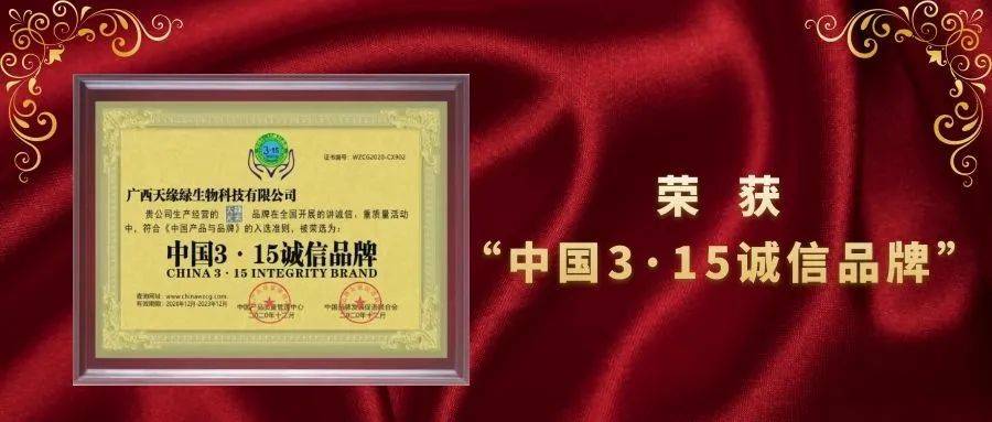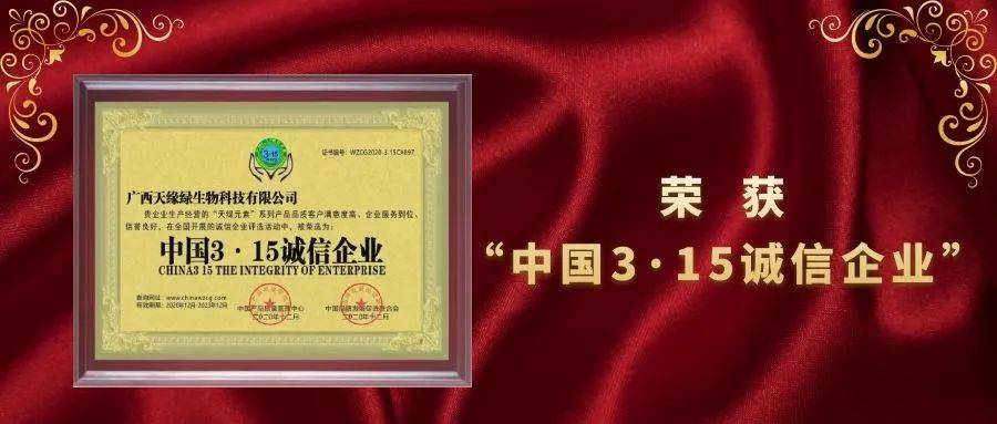 天缘绿集团母公司--广西天缘绿生物科技有限公司因经营的“天绿元素”系列产品品质客户满意度高、企业服务到位、信誉良好,在全国开展的诚信企业评选中,被荣选为“中国3·15诚信企业”。