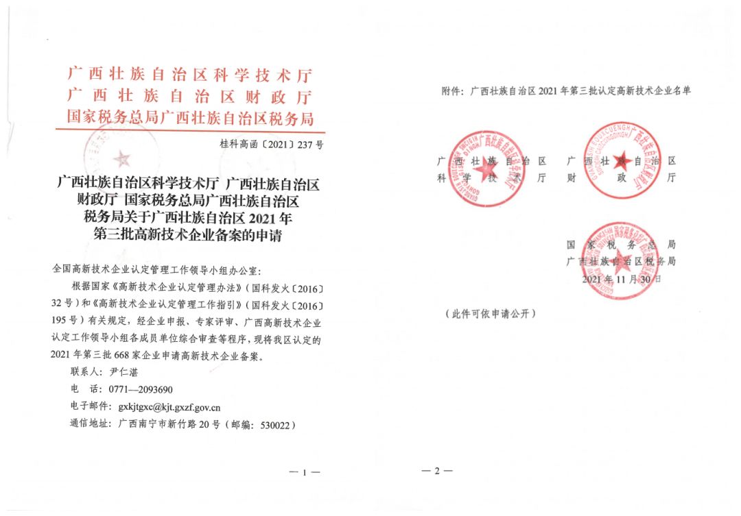 2021年11月30日,天缘绿集团子公司--广西中绿医药科技有限公司在经过专家评审、广西高新技术企业认定工作领导小组各成员单位综合审查等程序,顺利通过“高新技术企业”认定。