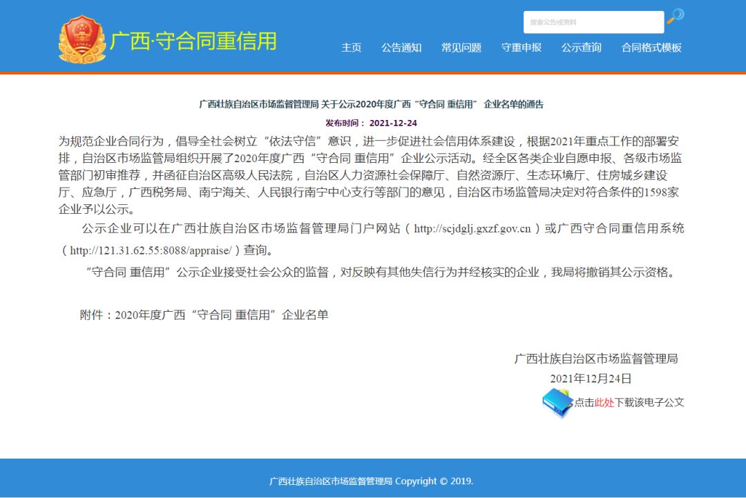 据悉,今年4月起,自治区市场监管局组织开展了2020年度广西“守合同 重信用”企业公示活动,旨在规范企业合同行为,引导企业诚信履约、守法经营,推进企业诚信建设,是社会信用体系建设的重要组成部分。