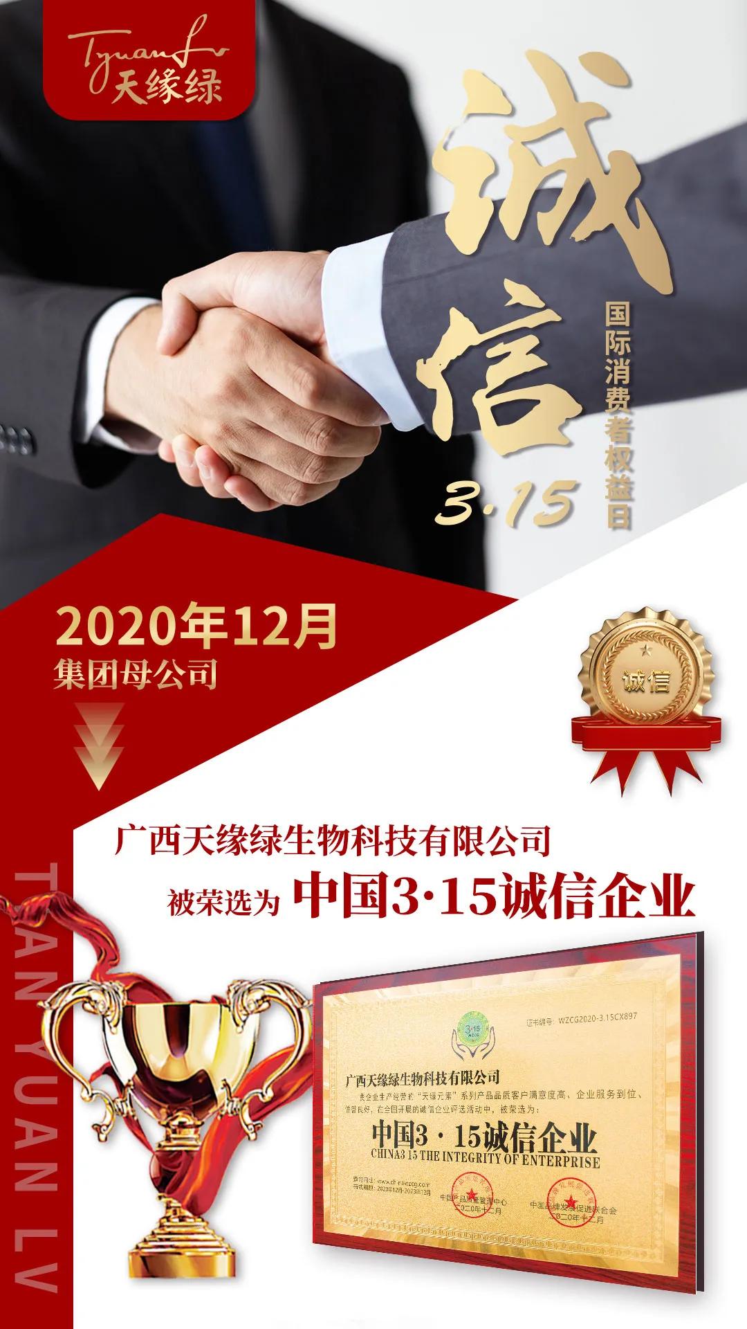 2020年12月,天缘绿集团母公司--广西天缘绿生物科技有限公司因经营的“天绿元素”系列产品品质客户满意度高、企业服务到位、信誉良好,在全国开展的诚信企业评选中,被荣选为“中国3·15诚信企业”。同时,“天绿元素”品牌也凭借品质和实力,经过重重筛选和检测后,在全国开展的讲诚信、重质量活动中,符合《中国产品与品牌》的入选准则,被荣选为“中国3·15诚信品牌”。