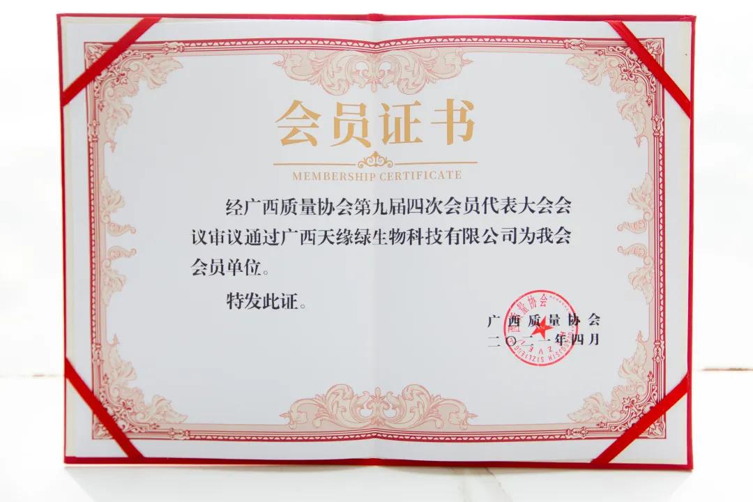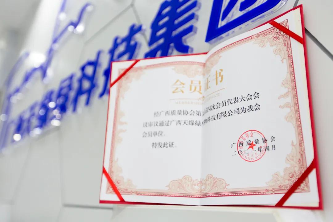 作为国家高新技术企业,集团在产品质量、诚信经营、科研创新等维度成果显著。近日,经广西质量协会第九届四次会员代表大会会议审议通过,集团母公司“广西天缘绿生物科技有限公司”正式加入广西质量协会,成为协会会员单位。