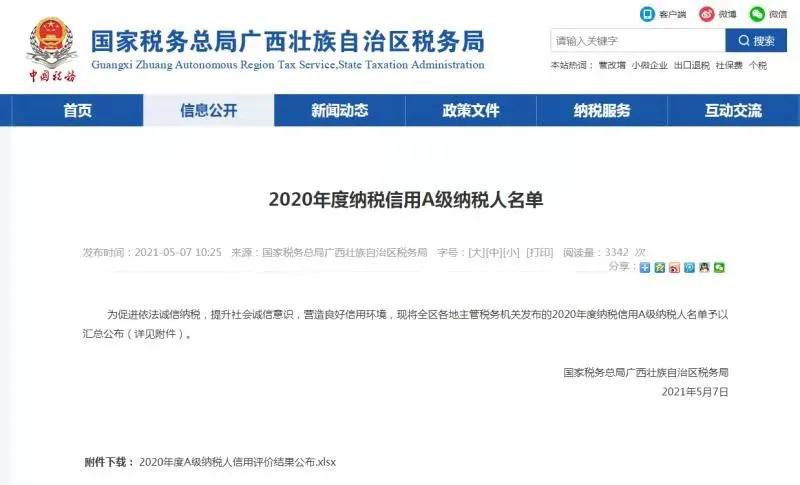 近日,国家税务总局广西壮族自治区税务局公布了《2020年度纳税信用A级纳税人名单》,天缘绿集团母公司“广西天缘绿生物科技有限公司”获评为2020年度“纳税信用A级纳税人”。