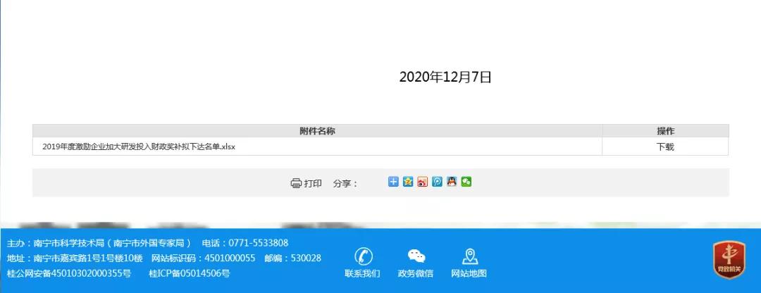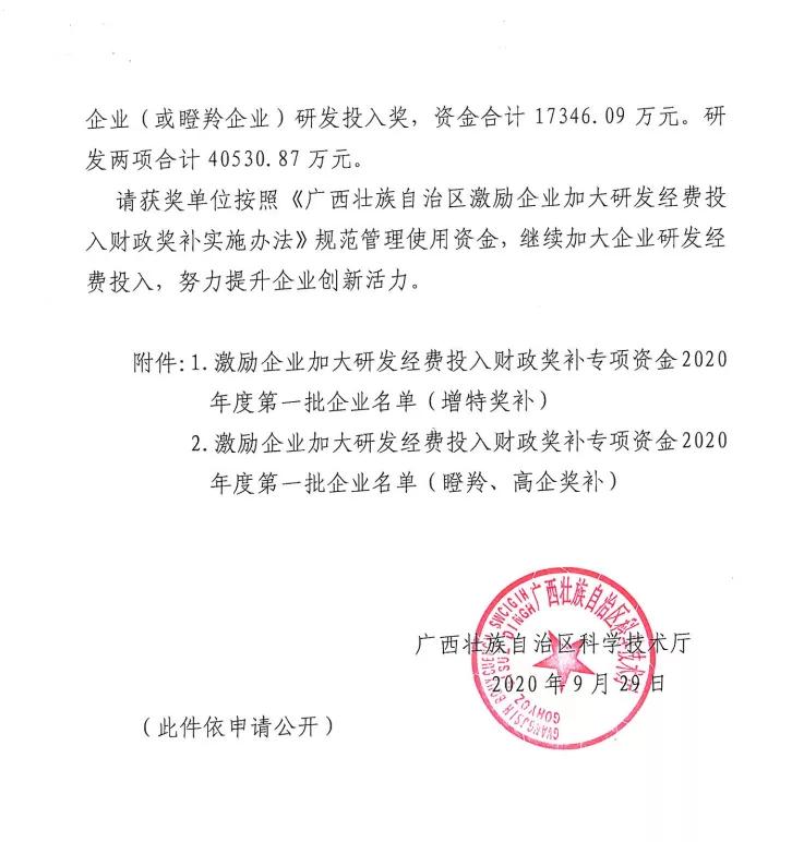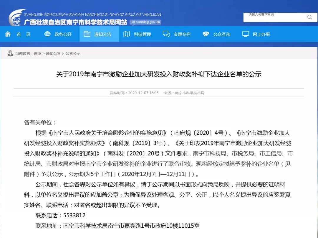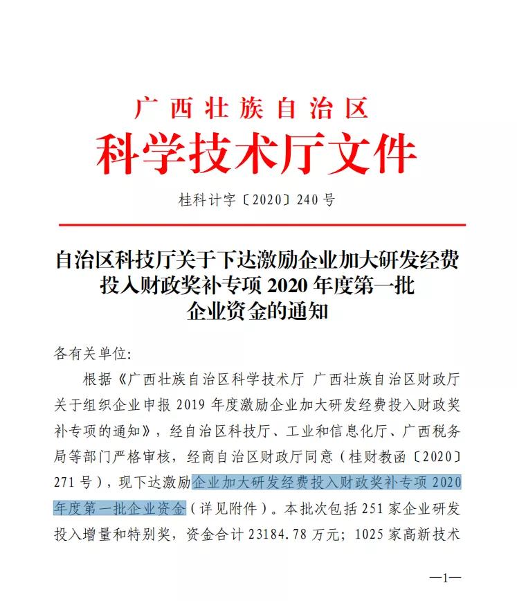 2019年,集团母公司通过了南宁市科技局、市税务局、市工信局、市统计局、市财政局的联合审核,获得了南宁市2019年研发投入财政奖补。