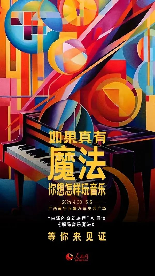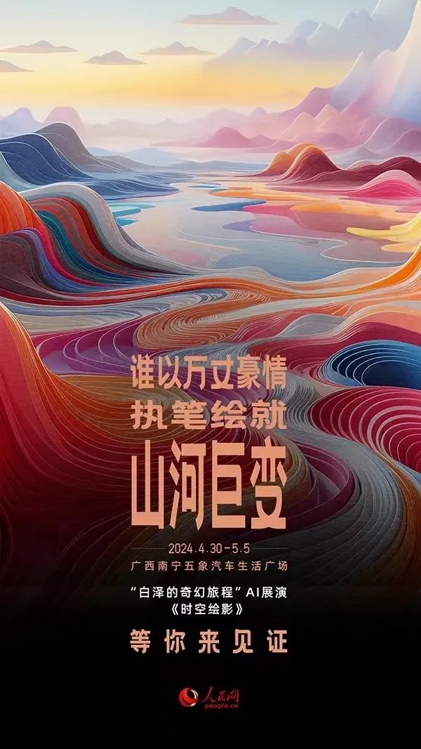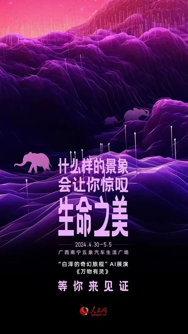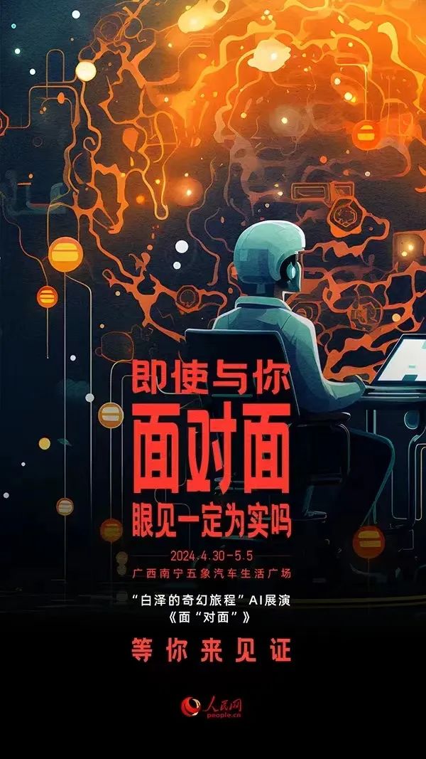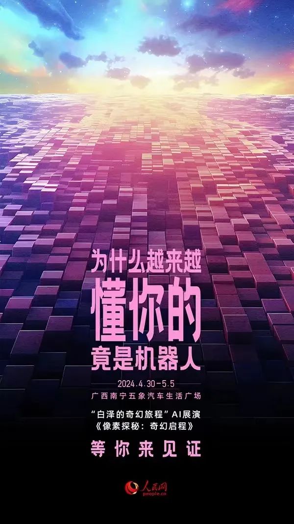 其中,作为此次主题活动之一,由人民网自主开发的国内首台AI展示体验活动《白泽的奇幻旅程》,于4月30日至5月5日,在南宁五象汽车生活广场面向公众展演,全方位、多角度、立体化集中呈现当前AI在各领域的创新发展与应用成果。