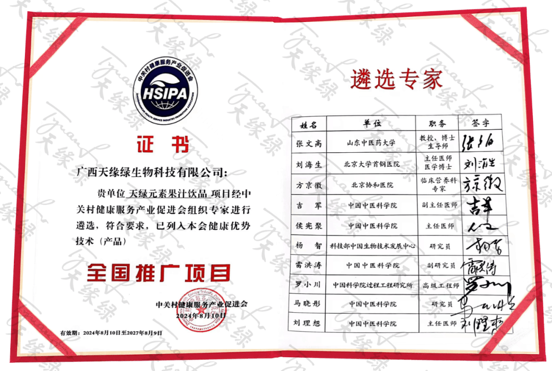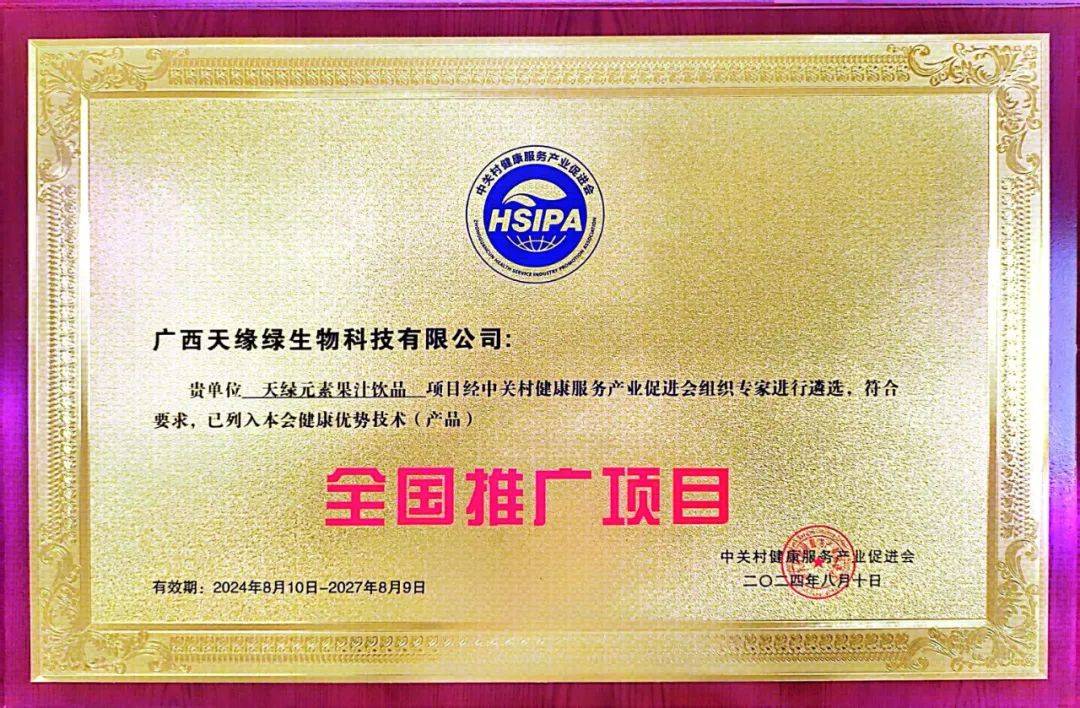 2024年8月10日,天缘绿集团迎来了历史性的荣耀时刻——母公司广西天缘绿生物科技有限公司主研产品『天绿元素』,经过中关村健康服务产业促进会严苛而权威的遴选流程,凭借其卓越的产品品质、创新的技术优势以及广泛的市场潜力,正式被列入中关村健康服务产业促进会健康优势技术(产品)全国推广项目。