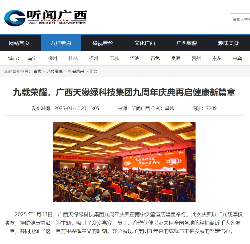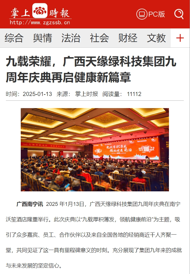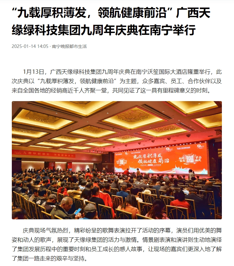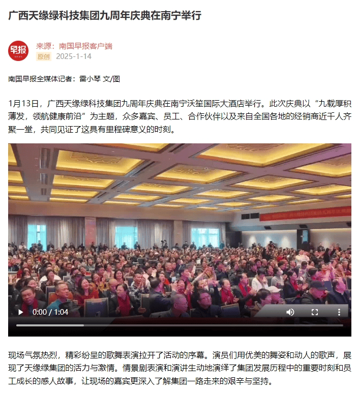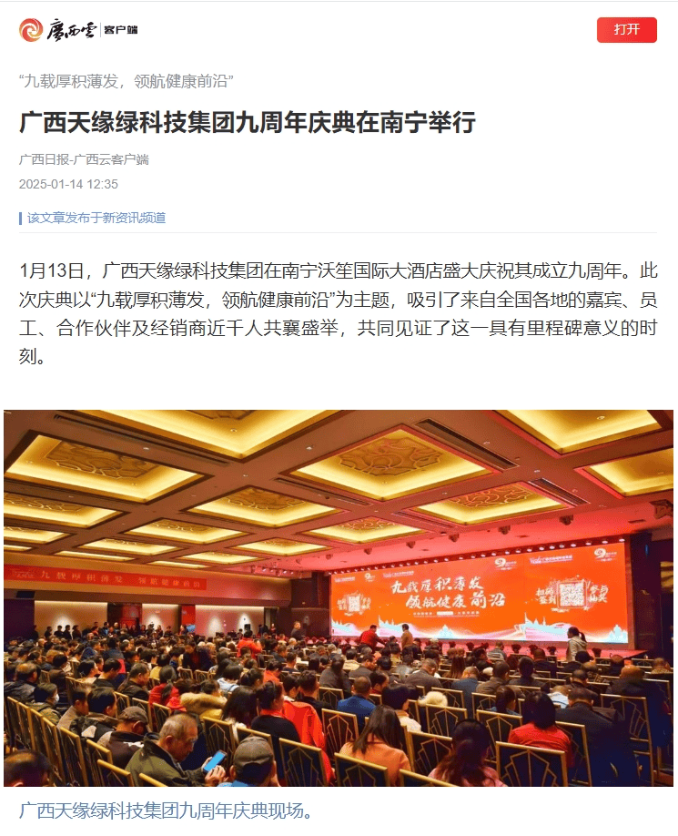 庆典盛况空前,南国早报、听闻广西、东盟新闻周刊、中国报道、东盟头条、掌上时报、广西县域经济网等三十多家新闻媒体纷纷聚焦此次庆典,竞相报道这一健康产业的盛事。媒体记者们用镜头捕捉每一个精彩瞬间,用笔触记录每一份感动与荣耀,将天缘绿集团九周年的辉煌与梦想传递给千家万户。
