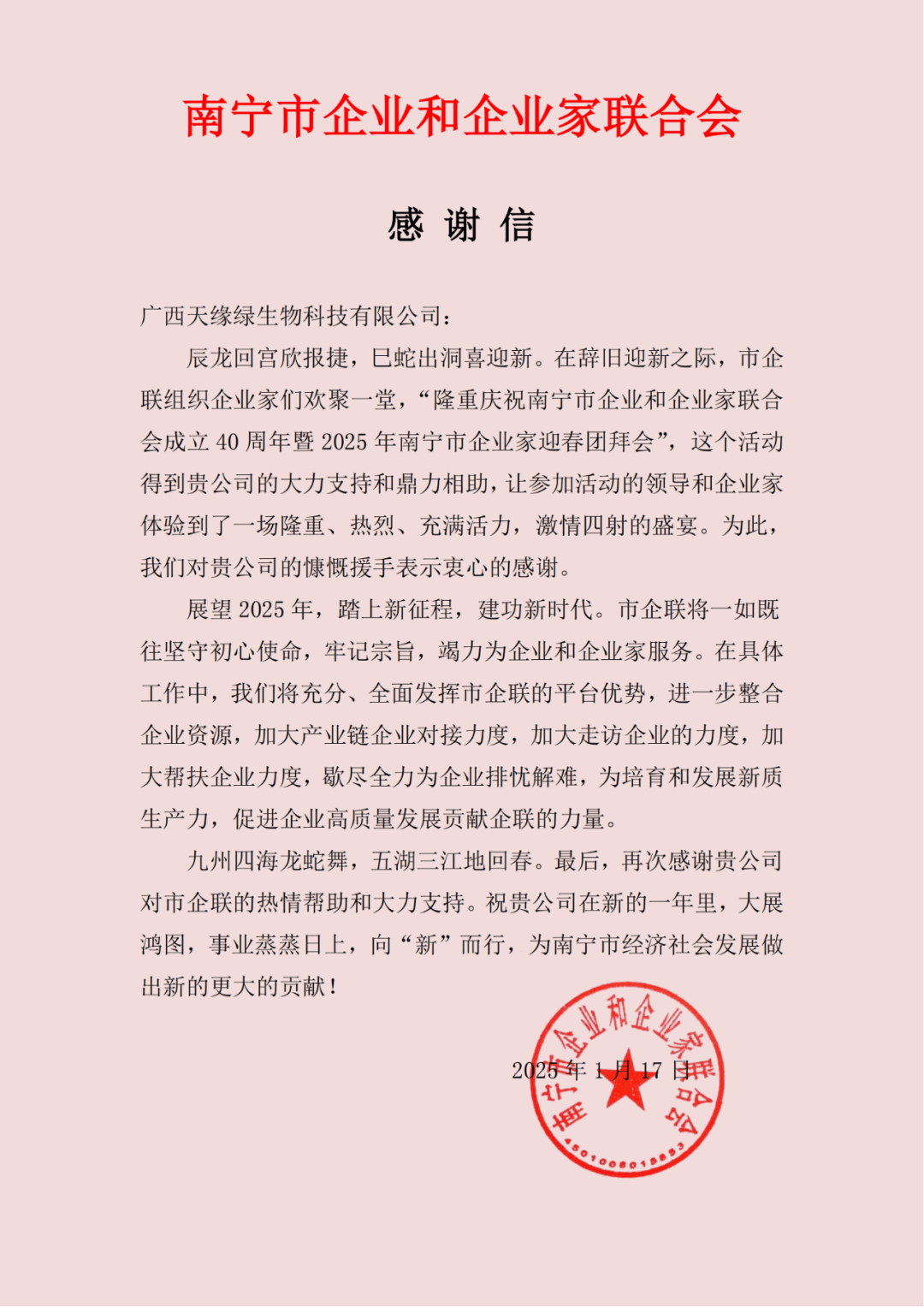 近日,广西天缘绿科技集团收到了南宁市企业和企业家联合会(简称“南宁市企联”)的深情感谢信,信中对天缘绿集团在“南宁市企联成立40周年暨2025年南宁市企业家迎春团拜会”中的慷慨支持与鼎力相助表达了由衷的感激。此次活动在天缘绿集团的助力下,不仅取得了圆满成功,更让每一位参与其中的领导和企业家深切感受到了市企联的热情与蓬勃活力。