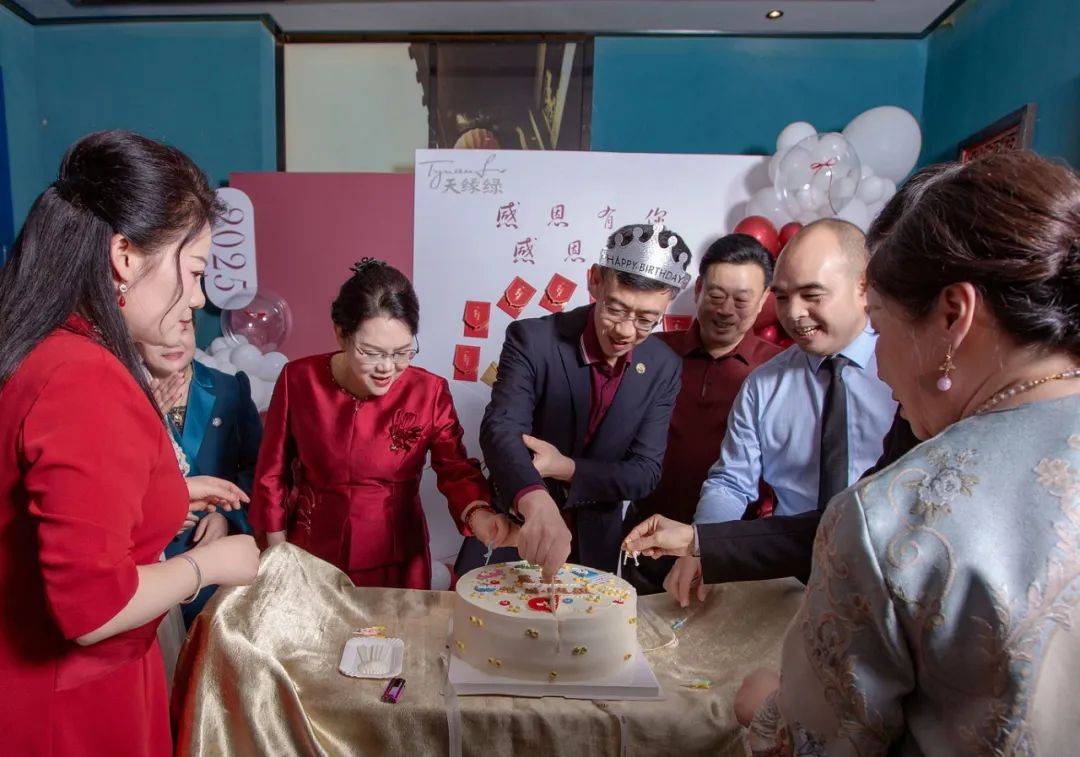 庆生环节将活动推向高潮,现场为二月生日的伙伴准备了惊喜蛋糕,大家齐唱生日歌,欢声笑语中洋溢着浓浓的情谊。随后的节目演出更是精彩纷呈,市场领导人及经销商们纷纷登台,用歌声、舞蹈,展现了天缘绿人的多才多艺与积极向上的精神风貌。