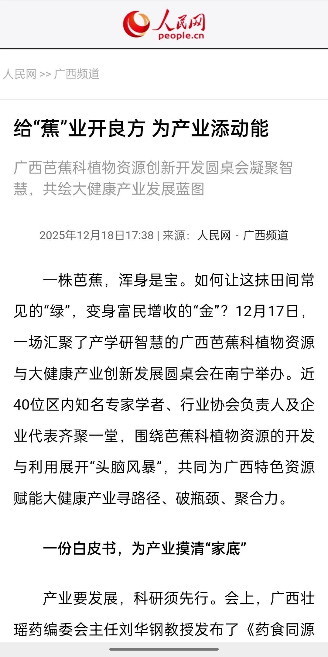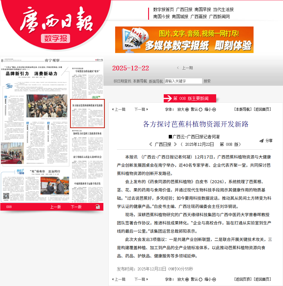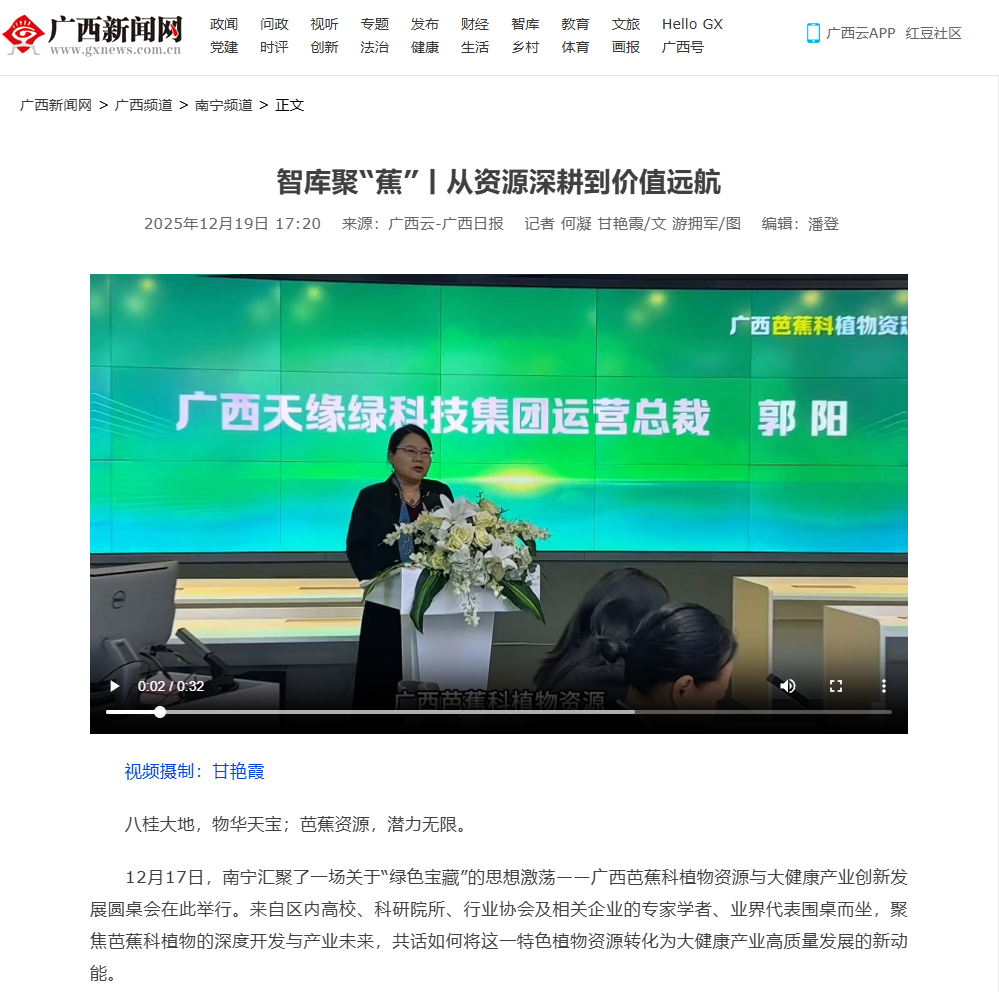 近日,由广西天缘绿科技集团主办的广西芭蕉科植物资源与大健康产业创新发展圆桌会,受到各级媒体广泛关注。